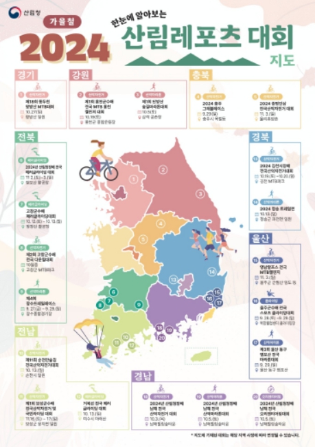 [뉴스서치] 산림청은 올가을 전국 각지에서 열리는 산림레포츠 대회 정보를 한눈에 볼 수 있는 ‘2024 산림레포츠 대회지도’를 발간해 배포한다고 25일 밝혔다.