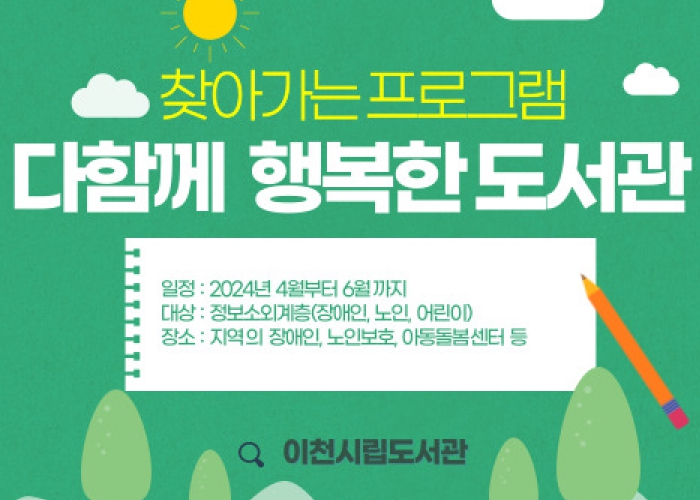 [뉴스서치] 이천시 시립도서관은 오는 4월부터 관내 지역아동센터, 장애인보호센터, 노인복지시설 등 지식정보 취약계층을 직접 찾아가는 “다 함께 행복한 도서관” 프로젝트를 시작한다고 밝혔다.