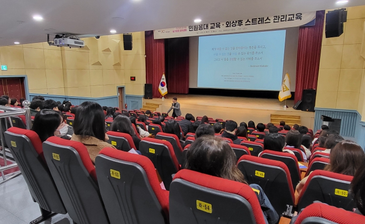 이번 교육은 심리상담공간 봄동의 연우석 소장을 초빙하여 “외상 후 성장”이란 주제로 총 3회에 거쳐 실시됐으며, 현장에서 직접 민원 응대를 담당하는 7급 이하 직원 300여명이 참석했다.