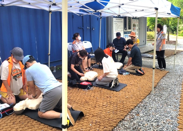 ▲ 의용소방대원들이 마장호수에서 심폐소생술 교육장 운영 중 |