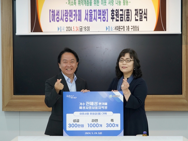 [뉴스서치] 서대문구는 최근 가수 진해성 공식 팬카페 ‘해성사랑서울지역방’로부터 취약계층을 위한 성금 300만 원, 라면 1,000개, 즉석 죽 300개를 기탁받았다고 28일 밝혔다.