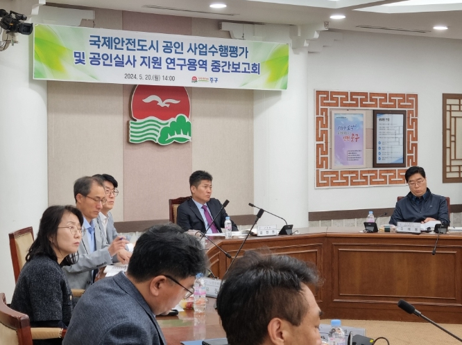이를 위해 지난 20일 중구청 서별관 회의실에서 김정헌 구청장, 안전 분야 부서·유관기관, 용역 관계자 등 20여 명이 참석한 가운데 ‘국제안전도시 공인 사업수행평가 및 공인실사 지원 연구용역’ 중간보고회를 열었다.