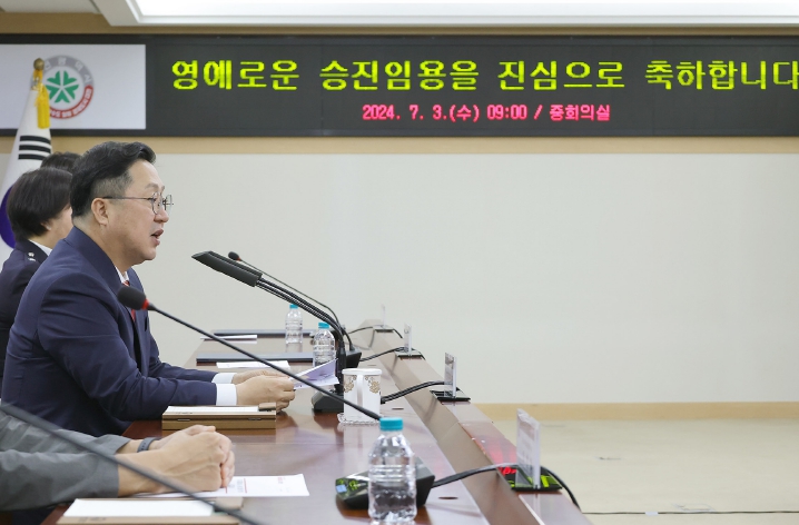 이장우 대전시장은 대전경찰청 범죄예방대응과 경감 강신진 등 승진 임용 대상 8명에게 임용장을 수여하고 계급장을 부착했다.