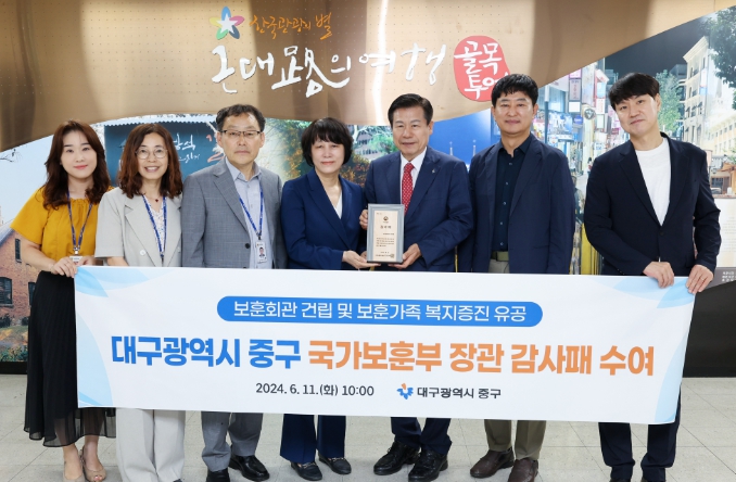 [뉴스서치] 대구 중구는 보훈회관 건립 및 보훈가족 복지증진에 대한 기여와 공로를 인정받아 11일 국가보훈부 장관 감사패를 받았다.