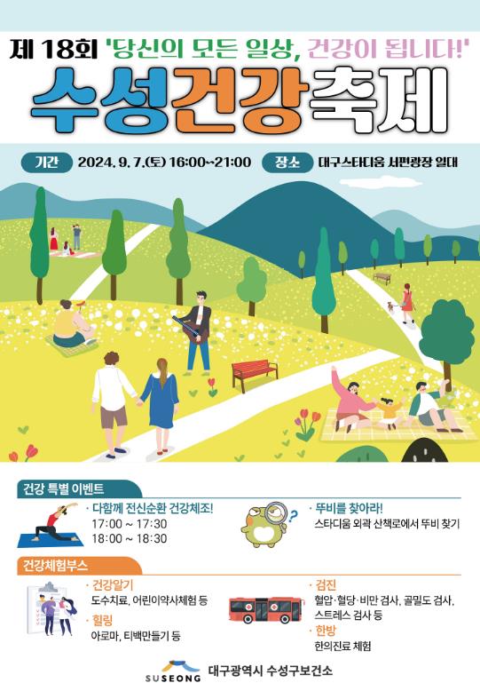 [뉴스서치] 대구 수성구는 오는 9월 7일 대구스타디움 서편광장 일대에서 ‘제18회 수성건강축제’를 개최한다.