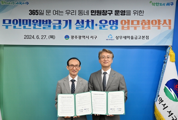 [뉴스서치] 광주광역시 서구와 상무새마을금고가 주민들의 민원 편의 증진을 위해 손을 맞잡았다. 양 기관은 27일 상무새마을금고 본점 내 무인민원발급기를 신규 설치하고, 상호 협력관계를 바탕으로 효율적인 운영을 위해 업무협약을 체결했다.