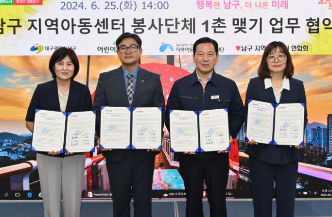 [뉴스서치] 대구 남구는 지난 25일 초록우산어린이재단 대구지역본부, 지역아동센터 대구지원단, 남구지역아동센터 연합회와 함께 "남구 지역아동센터 봉사단체와 1촌 맺기" 사업 협약(MOU)을 체결했다고 밝혔다.