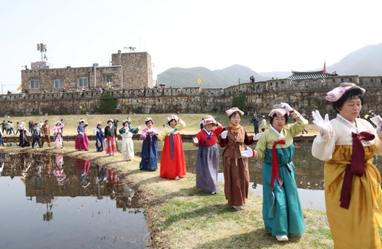 주 행사인 읍성밟기가 시작되자 한복을 곱게 차려입은 부녀회 회원들과 여성단체협의회 회원들로 구성된 긴 행렬이 머리에 돌을 이고 읍성 민속촌 앞에서 출발해 북문인 공북루(拱北樓)를 지나 태극문양의 연지 못을 돌기 시작했다. 연지 못에 비친 형형색색 한복차림의 행렬들은 봄꽃으로 만개한 청도읍성과 어우러져 장관을 이뤘다.