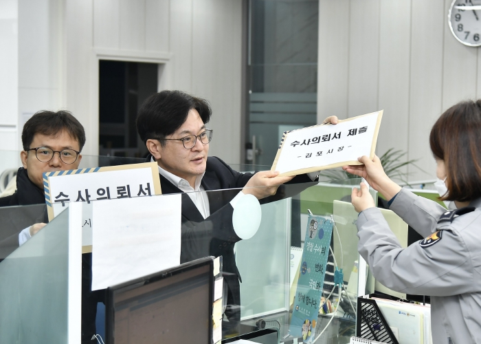 ▲ 지난 3월 13일 김병수 김포시장이 김포경찰서에 수사의뢰서를 제출하고 있다. |