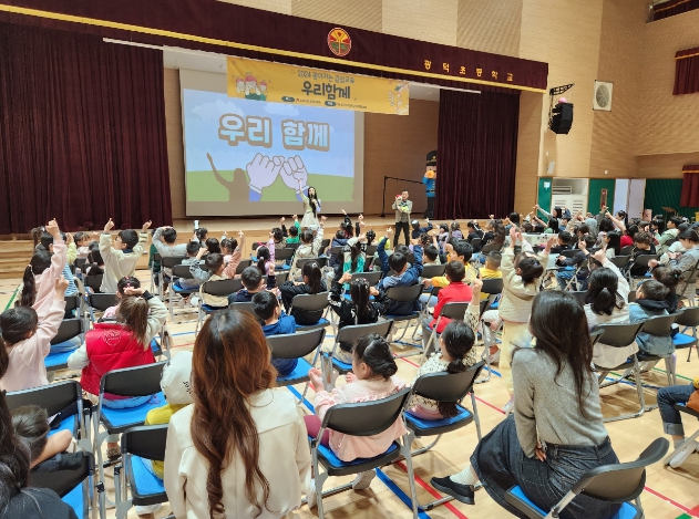 이날은 광덕초등학교 저학년 학생들과 선생님들이 함께 ‘우리 함께’라는 주제로 전문 작가와 연출, 실력있는 배우들이 참여해 수준을 높인 감성교육 연극을 관람했다.