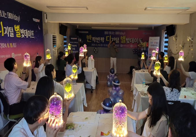 [뉴스서치] 대구 달서구는 15일 미혼남녀 20명을 대상으로 달서디지털별빛관에서 별빛관 체험 및 무드등 만들기 프로그램을 접목해 자연스러운 만남의 기회를 제공하는‘반(반짝 반짝) 디(디지털) 별(별빛) 데이트’를 운영했다.