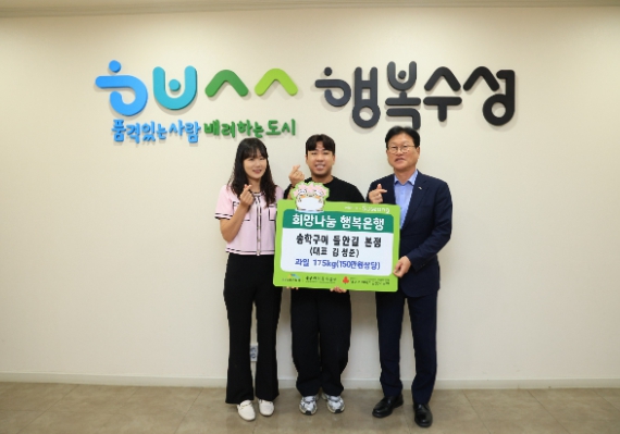 [뉴스서치] 송학구이 들안길 본점은 17일 지역 어려운 이웃을 위한 과일 175kg(150만원 상당)를 대구 수성구청에 전달했다.