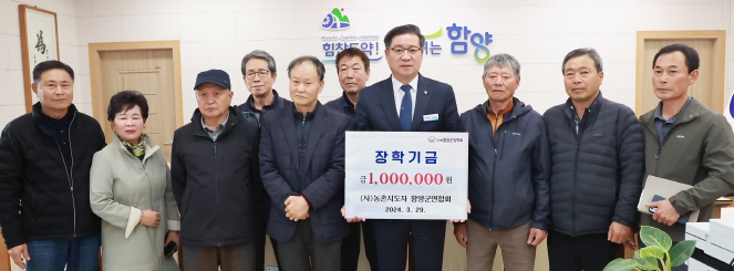[뉴스서치] (사)한국농촌지도자 함양군연합회는 3월 29일 오후 지역 교육 발전과 우수 인재 양성을 위해 (사)함양군장학회에 장학금 100만 원을 기탁했다.