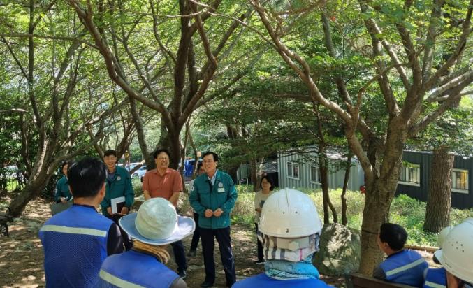 이번 현장점검은 7월 29일부로 부산 지역에 폭염경보가 내려지는 등 무더위가 지속됨에 따라, 여름철 폭염으로부터 현장(야외)근로자의 △ 폭염 특보 발령 시 휴식시간 부여 △ 폭염 안전수칙 준수 △휴게시설 설치 여부 등을 점검했고, 폭염 예방 물품(냉감타올, 부채)을 전달했다.
