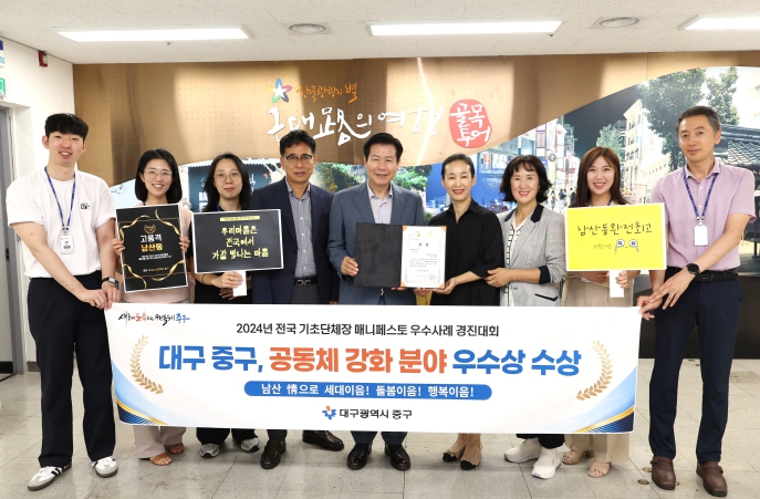 [뉴스서치] 대구 중구는 지난 31일 사)한국매니페스토실천본부와 경남연구원이 공동 주최한 ‘2024 전국 기초자치단체장 매니페스토 우수사례 경진대회’에서 ‘남산情으로 세대이음! 돌봄이음! 행복이음!’ 사례로 공동체 강화분야 우수상을 수상했다고 밝혔다.