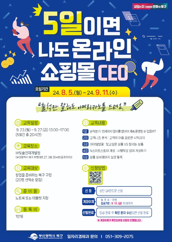[뉴스서치] 부산 북구는 오는 9월 23일부터 27일까지 5일간 북구 구민을 대상으로‘5일이면 나도 온라인 쇼핑몰 CEO 창업교육’을 실시한다고 밝혔다.