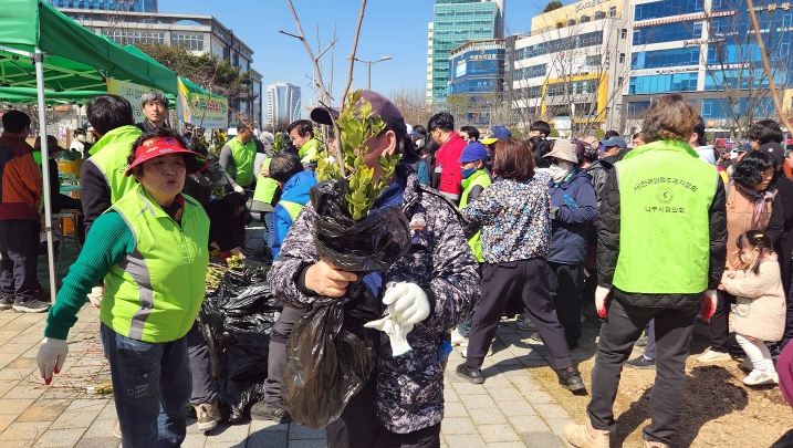▲ 나주시 임업후계자협의회(대표 남옥선)은 지난 주말 16일 빛가람호수공원 야외무대 일원에서 반려나무 3000본 나눔 행사를 가졌다. 선착순 1000명을 대상으로 왕대추, 태추단감, 황금사철 등 나무 3종을 세트로 마련해 총 3천본을 무료로 나눴다. (사진제공-나주시) |