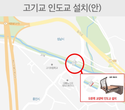 시는 또 인도가 없는 현재의 고기교를 주민들이 안전하게 통행할 수 있도록 기존 교량에 보도의 바닥 한쪽을 접속하는 캔틸레버 형식의 인도교를 설치한다.