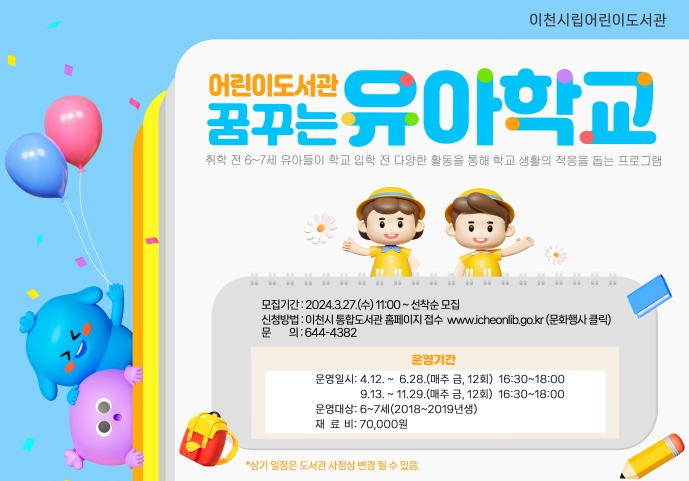 [뉴스서치] 이천시 어린이도서관에서 초등 입학 전 6~7세 어린이를 대상으로 “꿈꾸는 유아학교” 를 운영한다.