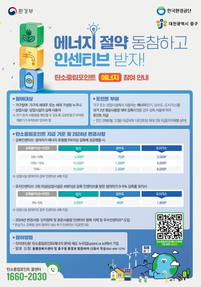 [뉴스서치] 대전 중구는 2023년 하반기 에너지 사용량을 감축하여 탄소중립 생활실천에 기여한 탄소중립포인트제 에너지분야 참여자에게 인센티브를 지급한다고 밝혔다.