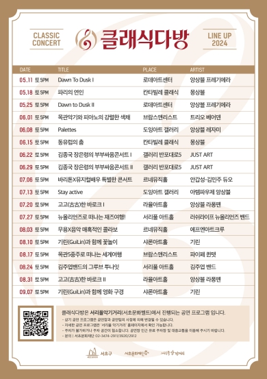 전성수 서초구청장은 “서초문화벨트를 주민들이 더욱 사랑하는 공간이 되게끔 만들겠다.”며 “‘2024 클래식다방’으로 음악예술인, 주민, 지역사회를 클래식 문화로 연결하는 문화예술도시 서초를 만들어 가겠다.”고 말했다.