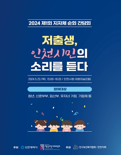 [뉴스서치] 인천광역시는 5월 23일 시청 대회의실에서 정부 ‘저출산고령사회위원회’와 공동으로 주최하고, 인구보건복지협회 인천지회가 주관하는 저출생 대응을 위한 정책간담회를 개최했다고 밝혔다.