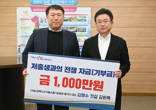 [뉴스서치] (가칭)경북수산식품수출기업협회 발기인 등은 20일 경북도 환동해지역본부에서 저출생과의 전쟁 성금 1,230만원을 경상북도사회복지공동모금회를 통해 경북도에 전달했다.