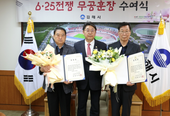 [뉴스서치] 김해시는 20일 시장실에서 6·25전쟁에 참전해 공을 세운 故조우익 병장, 故양만수 중사의 유가족에게 국방부장관을 대신하여 화랑무공훈장을 전달하는 전수식을 가졌다.