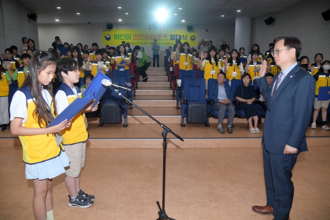 ▲ 고광완 광주광역시행정부시장이 12일 오전 시청 무등홀에서 열린 ‘어린이 안전히어로즈 발대식’에 참석해 위촉장을 수여한 후 어린이 대표로부터 안전실천 선서를 받고 있다./광주광역시 제공 |