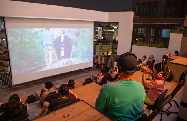 주변이 주거지역임을 고려하여 소음공해를 줄이고 영화 관람객은 풍부한 음향을 느낄 수 있도록 헤드셋을 착용하고 영화를 감상한다.