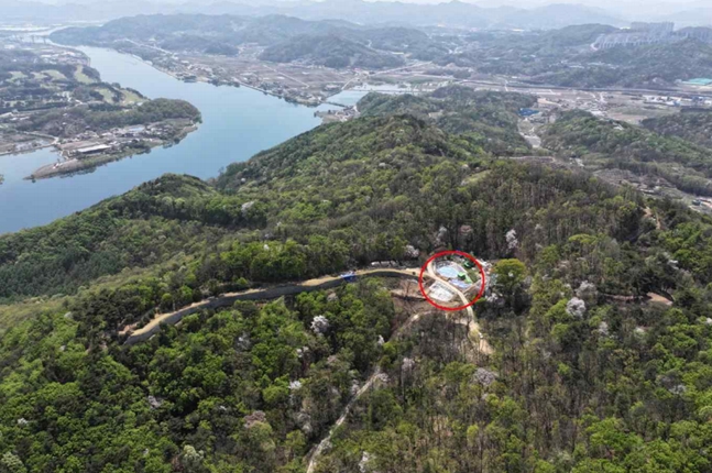 ▲ 충주 장미산성과 한강 원경(조사지역:붉은색) |
