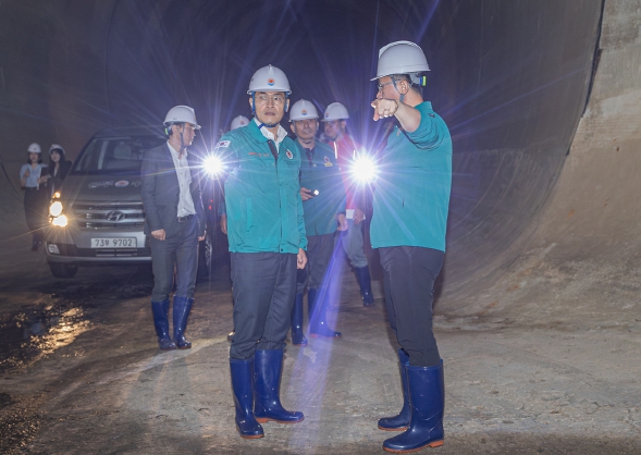▲ 29일 오전 신월빗물저류배수시설 지하 3.6km 구간에 직접 들어가 풍수해 대비 현장점검 중인 이기재 양천구청장 |