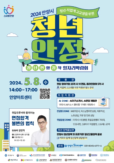 부대행사로는 취업유튜버 강민혁의 면접특강이 2시부터 진행되고, 올해 안양시에서 도입한 ‘AI자소서 작성 플랫폼’을 체험해 볼 수 있는 AI ZONE이 마련된다. 이 외에도 퍼스널 컬러진단, MBTI 검사, 크로마키 가상직업 촬영 등의 서비스를 받을 수 있다.
