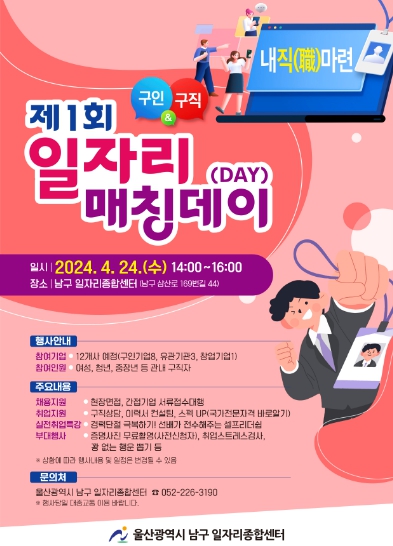 [뉴스서치] 울산 남구는 오는 24일 남구 일자리종합센터에서 구인기업의 채용 시기에 맞춘 현장면접과 실전취업특강 등 다양한 취업지원 콘텐츠를 운영하는 ‘제1회 일자리 매칭데이’를 개최한다고 밝혔다.