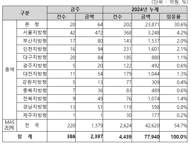 지역별 발주량을 보면, 총액계약 대상 1,018억 원 중 본청이 64억 원으로 6.3%를 집행하고 서울청 등 11개 지방청에서 954억 원을 각각 집행할 예정이다.