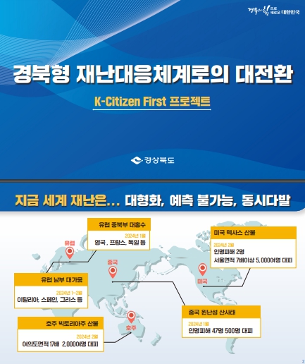 [뉴스서치] 경북도는 재난의 일상화, 극한(대형)화에 따라 기존 관 주도 사후 대응에서 민 ・ 관 협력 사전 예방 체계 구축을 위해 도민 안전을 최우선 원칙으로 하는 ‘K-CITIZEN FIRST 프로젝트’를 본격 추진한다.