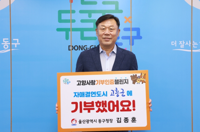 [뉴스서치] 김종훈 동구청장이 8월 12일 지역사회 기부문화 촉진과 고향사랑기부제 활성화를 위한 ‘고향사랑 기부 인증 챌린지’에 동참했다.