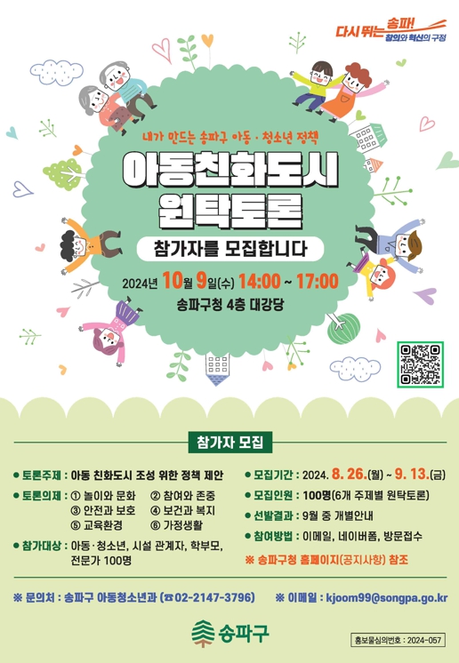 원탁토론회는 아동친화도시 조성을 위한 세부 추진 전략과 핵심 과제를 도출하는 자리이다. 오는 10월 9일 14시 송파구청 대강당에서 개최된다. 송파구에 거주하는 아동·청소년, 아동·청소년 시설 관계자, 학부모, 전문가 등이 참여한다.