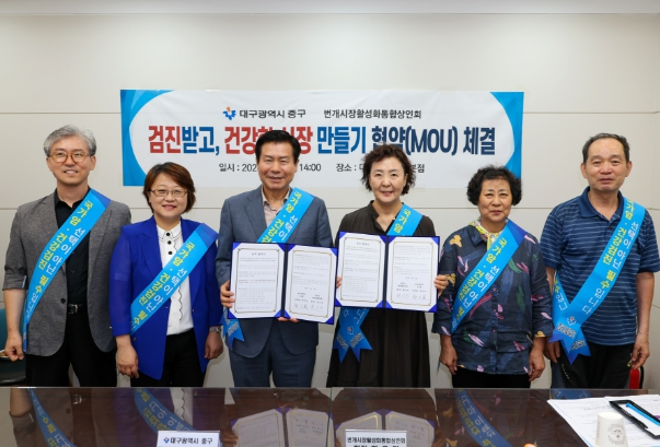 [뉴스서치] 대구 중구는 8일 번개시장(태평로 177-1)에서 번개시장 활성화통합상인회(회장 화은경)와 검진받고 건강한 시장 만들기 업무협약(MOU)을 체결했다.
