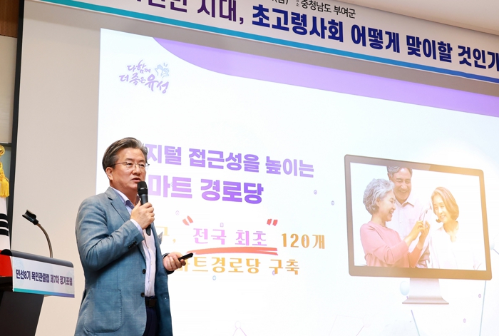 ▲ 정용래 유성구청장이 5일 충남부여군 롯데리조트에서 유성구 스마트경로당 우수사레를 발표했다. |