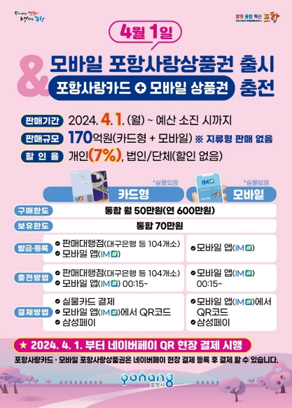 [뉴스서치] 포항시는 내달 1일 모바일 포항사랑상품권을 출시하는 한편 카드형·모바일 포항사랑상품권 170억 원을 발행해 4월 상시 7% 할인판매를 시작한다고 밝혔다.
