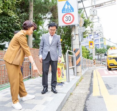 진 구청장은 부족한 보행로, 높은 횡단보도 경계석 등 어린이들의 안전한 보행을 위협하는 요소를 꼼꼼히 살폈다.