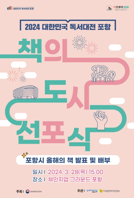 ‘책의 도시 선포식’은 2024 대한민국 독서대전 포항의 시작을 대내외로 알리는 자리로, 선포식을 시작으로 5개 분야 100여 개의 다양한 연간독서문화프로그램이 본격적으로 추진되며 오는 9월 27부터 29일까지 3일간 영일대해수욕장 일원에서 본행사가 진행된다.
