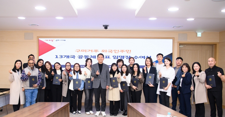 [뉴스서치] 구미시는 20일 시청 국제통상협력실에서 관내에 거주하는 13개국 외국인 주민 공동체 대표에 임명장을 수여했다.