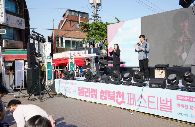 ▲ 서울 성북구와 성북천 골목형상점가 상인회가 27일 성북천분수마루에서 개최한 ‘제2회 블라썸 성북천 페스티벌’이 성료했다. 성북천상인회 고요찬 이사가 행사의 시작을 선언하고 있다. |