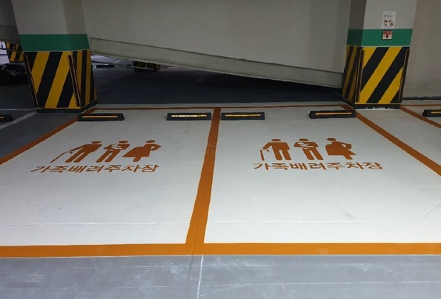 가족배려주차장은 사각지대가 없는 밝은 곳과 주차장 출입구 또는 승강기, 계단과 가까워 접근성 및 안전성이 확보되는 구간에 설치됐다. 주차장 진입 시 쉽게 알아볼 수 있도록 주차구획은 흰색 바탕에 꽃담황토색 실선으로 ‘가족배려주차장’ 그림, 문구와 함께 표시됐다.