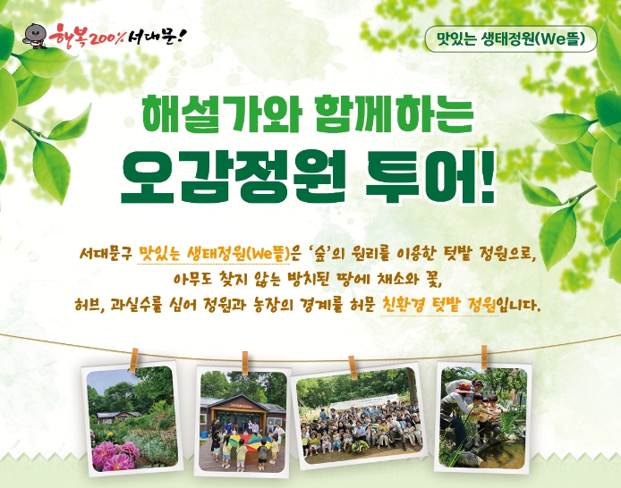 [뉴스서치] 서대문구가 건전한 여가선용과 도심 속 힐링의 기회를 제공하기 위해 ‘맛있는 생태정원 We뜰’(송죽길 60)에서 ‘해설가와 함께하는 오감정원 투어’를 추진한다.