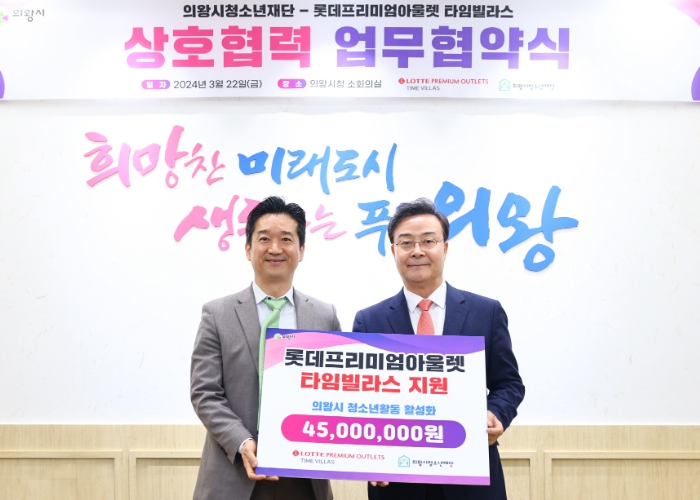 협약식에는 의왕시청소년재단 김성제 이사장, 원억희 대표이사, 롯데프리미엄아울렛 타임빌라스 박상옥 점장 등 관계자 10여 명이 참석했다.