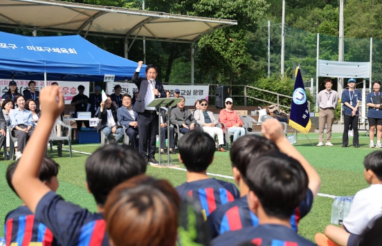▲ 박강수 마포구청장이 제23회 마포구청장배 학교대항 어린이 축구대회에 참석해 선수들을 응원하고 있다. |