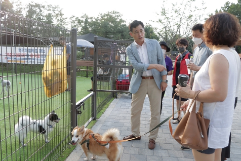 ▲ 용왕산 반려견쉼터를 찾아 주민과 소통 중인 이기재 양천구청장 |